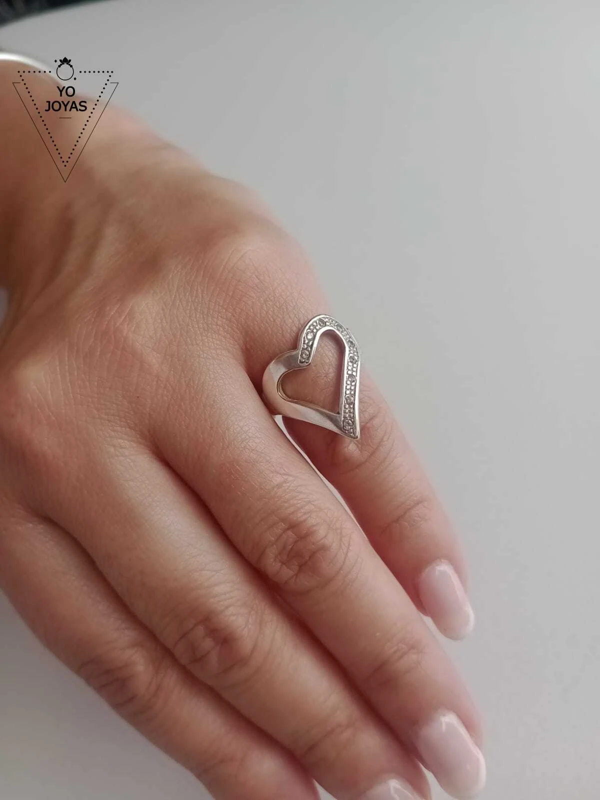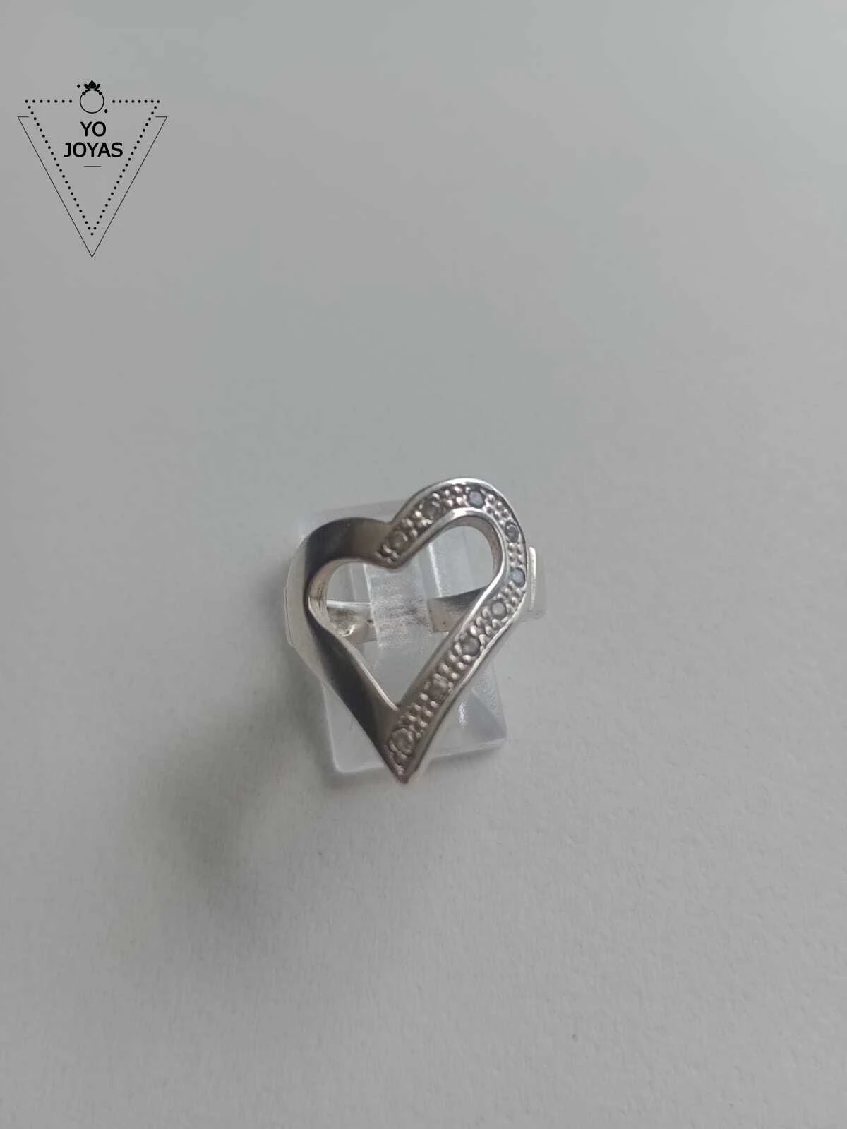 Anillo de plata resenta un diseño de corazón calado con una línea de pequeñas piedras brillantes a lo largo de uno de sus lados.