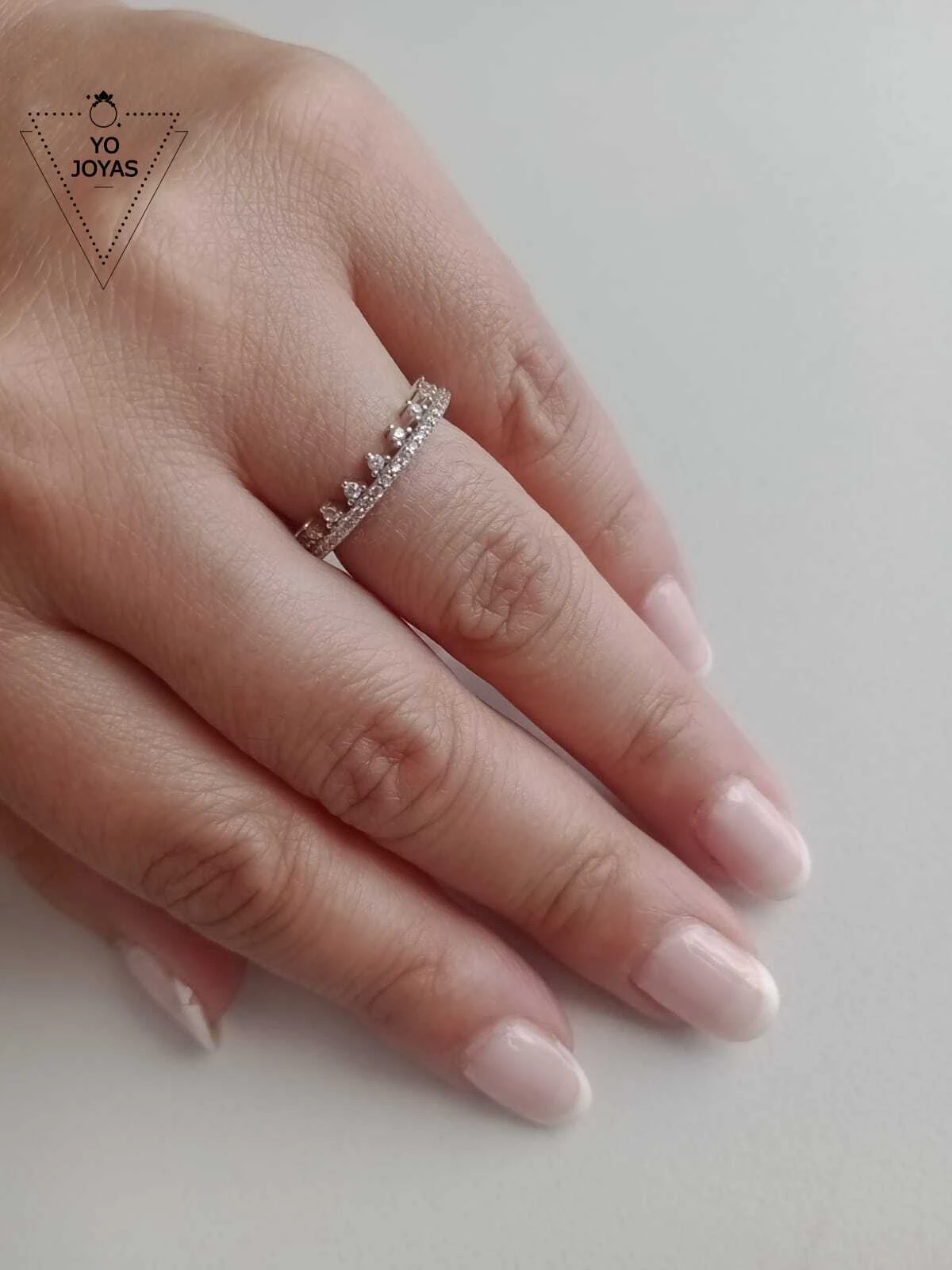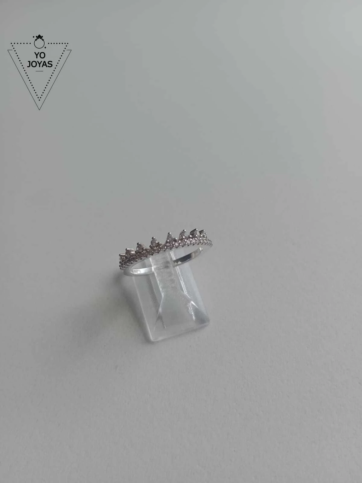 El anillo que se muestra en la imagen es un anillo tipo corona o tiara, a menudo fabricado en plata 925 y adornado con piedras cúbicas o circonitas para darle brillo..