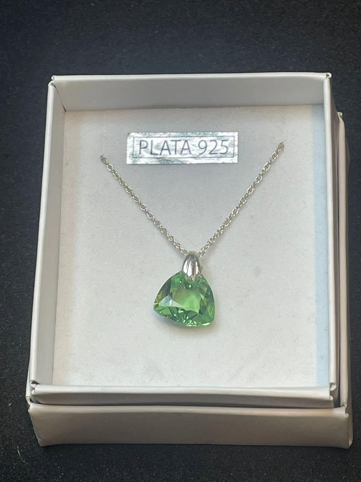 Material: Plata de ley 925 (Sterling Silver), como se indica en la etiqueta de la imagen. Colgante: Un cristal verde, probablemente peridoto o vidrio de uranio, tallado en forma triangular (trillón). El peridoto es la piedra natal de agosto. Estilo: Un diseño minimalista y elegante, adecuado para diversas ocasiones. Significado: Las piedras verdes suelen simbolizar crecimiento, prosperidad y bienestar.