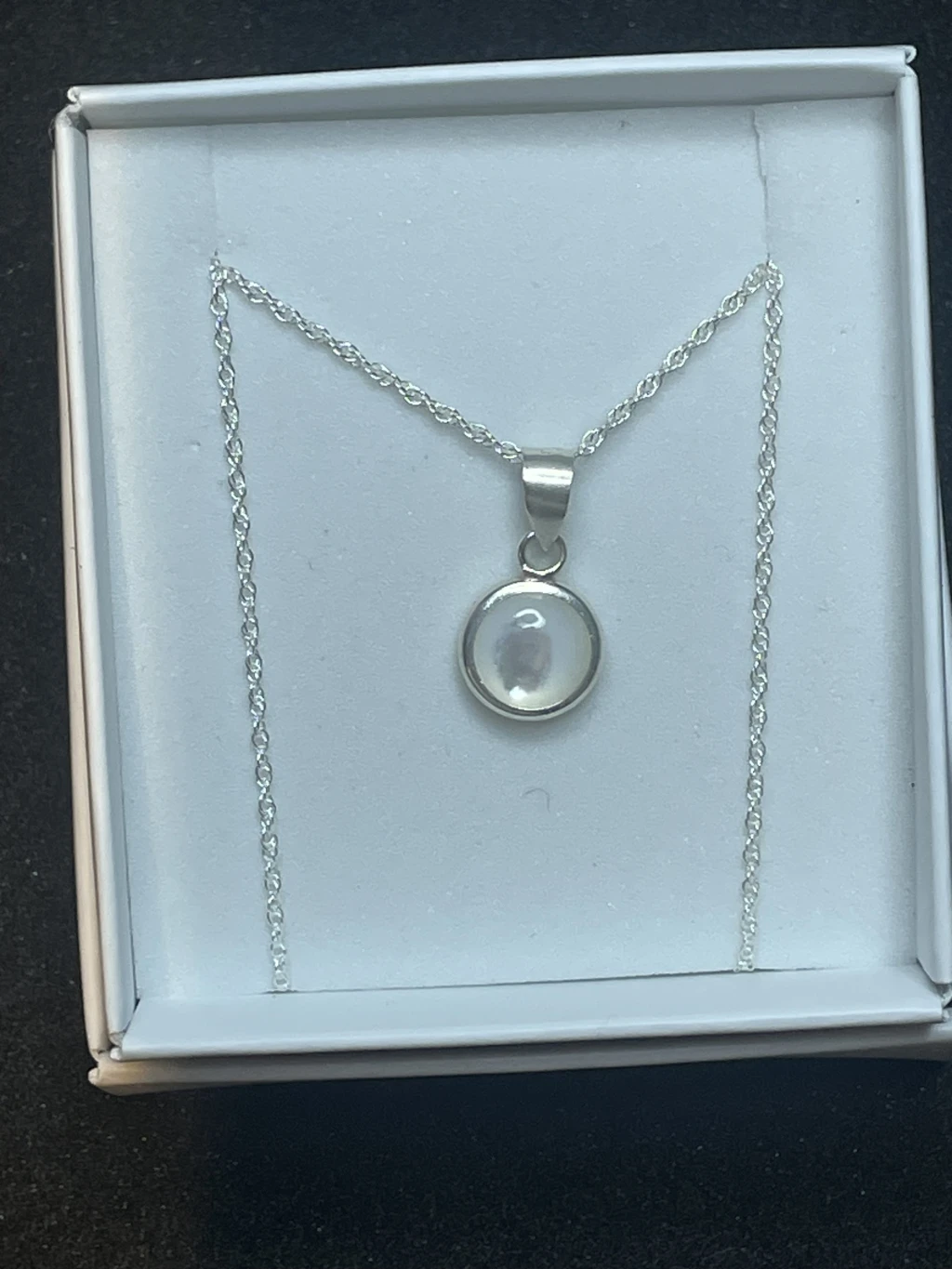 Material: Plata de ley 925 (común en joyería por su resistencia y calidad). Colgante: Presenta un dije ovalado con una piedra blanca, que es probable que sea nácar (madreperla) o piedra luna. Nácar: El nácar es conocido por su brillo iridiscente y simboliza la pureza. Piedra Luna: Esta gema se asocia con la feminidad, la intuición y el equilibrio emocional. Estilo: El diseño es delicado y atemporal, ideal para uso diario o como regalo.