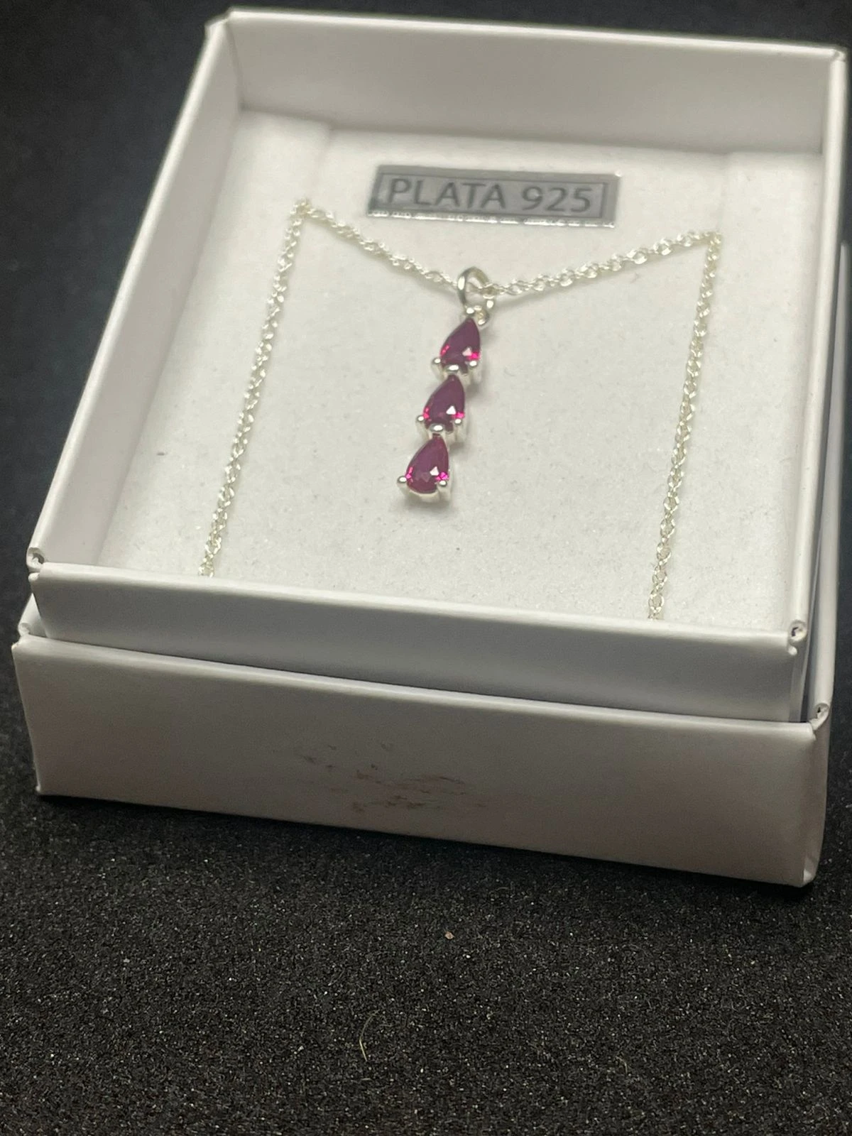 Material de la cadena y el colgante: Plata de ley 925 (Sterling Silver). Piedras: Generalmente se comercializan como rubíes naturales, rubíes creados en laboratorio o circonitas cúbicas de color rubí, en forma de pera o lágrima. Estilo: Colgante de tres piedras (three-stone pendant) que simbolizan energía, vitalidad y pasión.