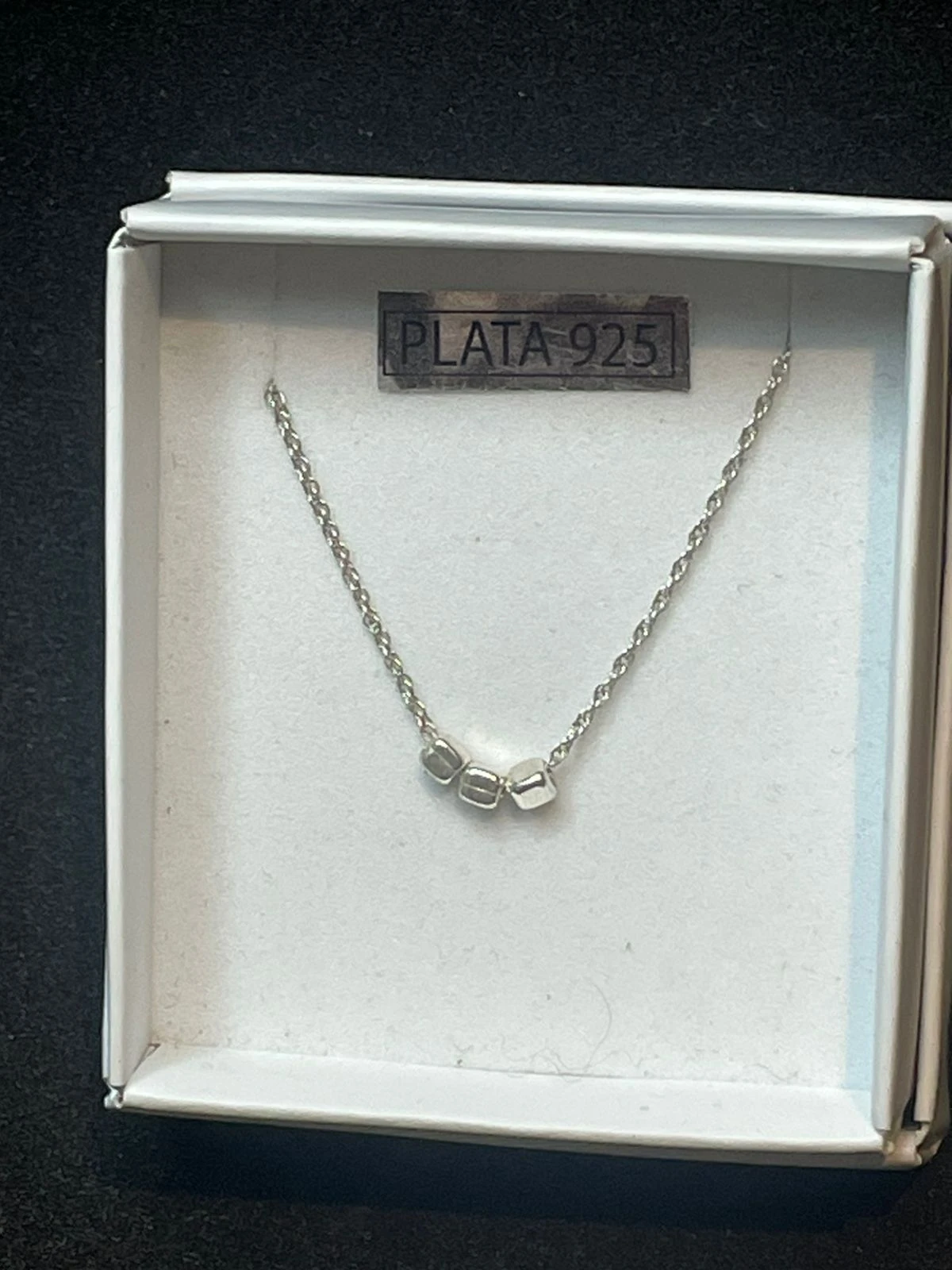 Material: Está hecho de plata 925 (también conocida como plata de ley), lo que significa que la aleación contiene un 92,5% de plata pura y un 7,5% de otros metales (generalmente cobre) para aumentar su resistencia y durabilidad, ya que la plata pura es demasiado blanda para joyería. Diseño: Presenta una cadena fina de eslabones cuadrados entrelazados y tres cuentas cuadradas móviles como adorno.